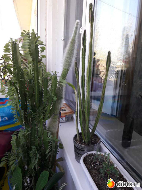 Ну как сам... с палкой и... рискнула я и подсадила его к молочаю-мексиканцу. Рисковала, думала, оба погублю я своими экспериментами. Муж даже ругался)))) Но выжили оба. Правда таки пушистый и хилый который, всё-таки пора пересаживать, ибо мексиканец разрастается, уже такое дерево. 1,30 ростом. я его толком и сфотать уже не могу.