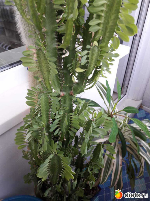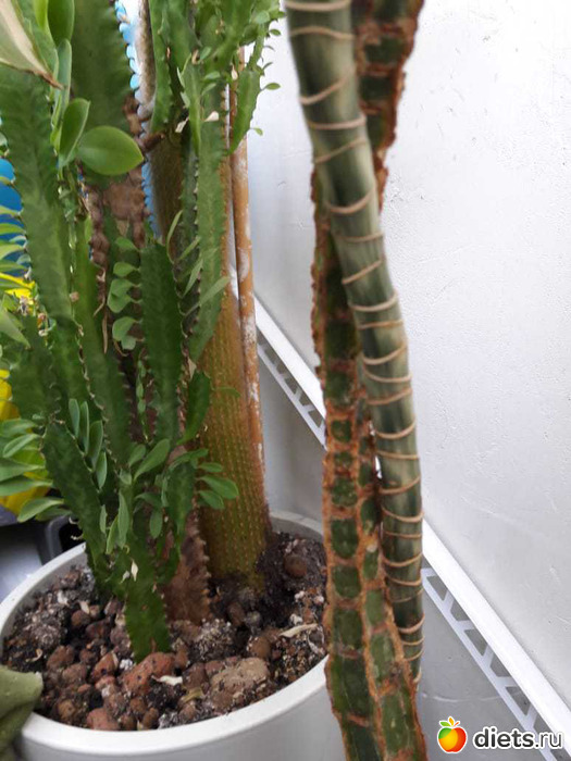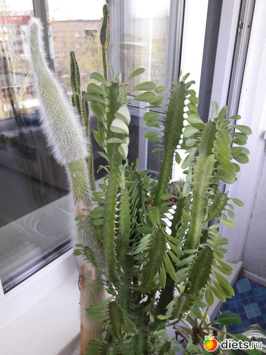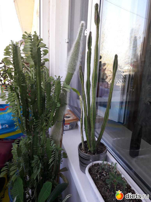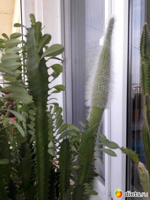 Ну как сам... с палкой и... рискнула я и подсадила его к молочаю-мексиканцу. Рисковала, думала, оба погублю я своими экспериментами. Муж даже ругался)))) Но выжили оба. Правда таки пушистый и хилый который, всё-таки пора пересаживать, ибо мексиканец разрастается, уже такое дерево. 1,30 ростом. я его толком и сфотать уже не могу.