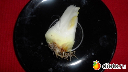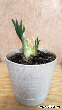 Я луковицы, у которых начали появляться зелёные пёрышки всегда сажу на зелень. Оказывается, можно сделать по другому. Взять луковицу и обрезать её с 4 сторон.