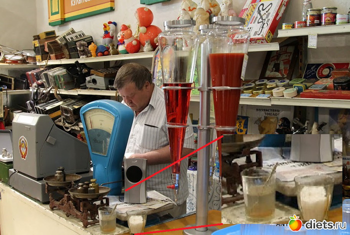 Внизу у конусов были краники. А в конусах были разные соки. Обычно - яблочный осветленный, персиковый с мякотью и самый дешевый - березовый (тоже с мякотью. Часто - томатный. И стояла солонка, из которой пальцами брали щепотку, посолить томатный сок. Но это - взрослые. Я не видел детей, пивших томатный сок.
