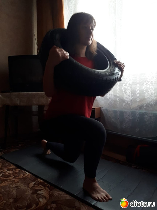 Позавчера муж поменял резину и принес ее домой. Здесь у меня нет, кроме коврика, абсолютно никаких снарядов для спорта, приседания я делала с альпинистской веревкой, она весит около 5 кг. Увидела колесо и поняла - вот оно!!