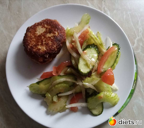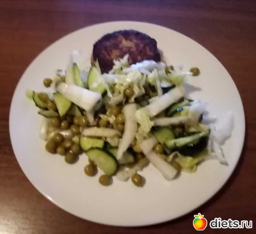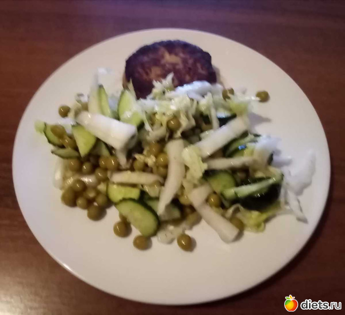 Котлеты куриные + салат из капусты с огурцом и горошком.