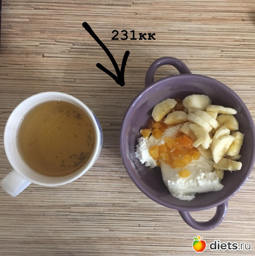 Завтрак: творог с курагой и бананом. Чаинки в кружке зеленого чая выглядят не очень..