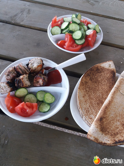 Сегодня у нас в меню: шашлык из свинины, лаваш с сыром и зеленью, огурцы-помидоры, фанта зеро (нулевой калорийности) и кофе в термосе.