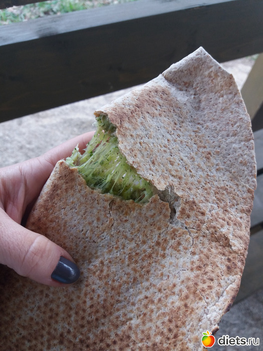 В готовый магазинный лаваш заворачиваю начинку, которую заранее подготавливаю дома: в блендере измельчаю любой ферментный сыр и пучок зелени, зелень тоже подходит любая, например, лук-перо и укроп. Альтернативный вариант начинки: сыр фету (или сыр брынзу) смешиваю с мелко нарезанным помидором и чесноком, пропущенным через пресс