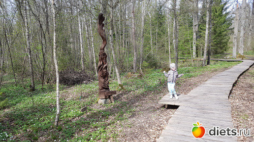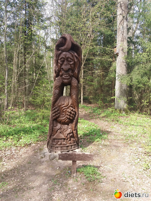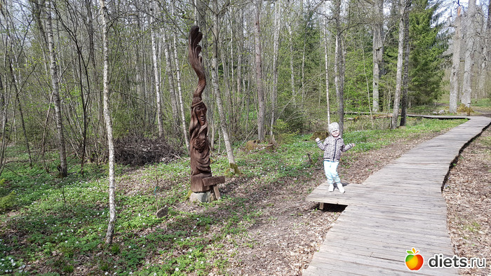 Тут вся тропа вымощена деревянными дощечками. И вдоль торпы стоят деревянные скульптуры, изображающие языческих литовских богов.