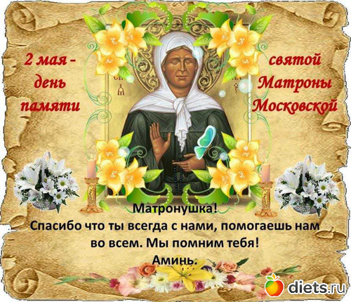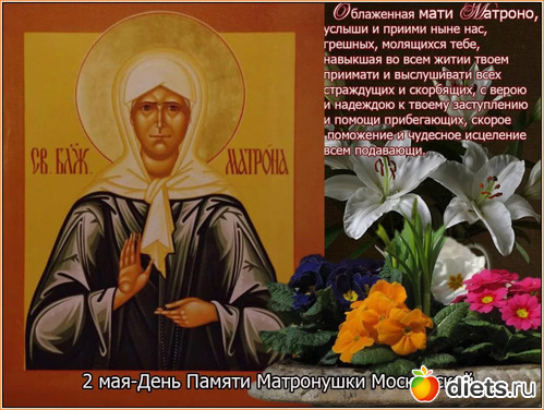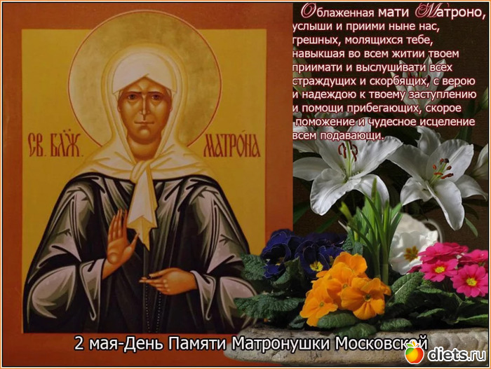 Общецерковный день памяти Блаженной Матроны Московской — 2 мая по новому стилю. Блаженная Матрона Московская (в миру — Матрона Дмитриевна Никонова) — святая, которая жила в 1881 — 1952 годах и была прославлена в лике местночтимых святых Московской епархии в 1999-ом, а к лику общецерковно почитаемых святых — в 2004-ом.