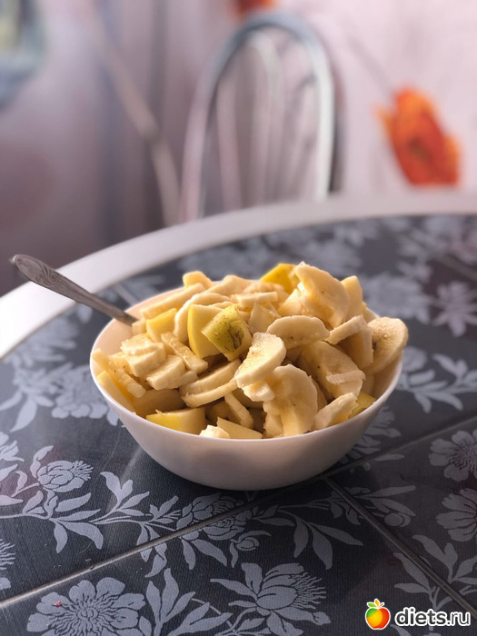 Сегодня белковый день, завтрак: банан+яблоко в виде некоего фруктового салата+ чашка кофе с молоком, в кадр не попала