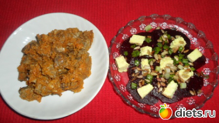 3. Ужин: жареная тыква с куриной печенью и чесноком; карпаччо со свёклой, жареными семечками подсолнечника, домашним копчёным сыром, зелёным луком, лимонным соком, морской солью, оливковым маслом. Спасибо за рецепт Liliya_Z. Как это вкусно! Казалось бы простые ингредиенты. Свёклу любим. И этот рецепт займёт место в нашей кулинарной книге.