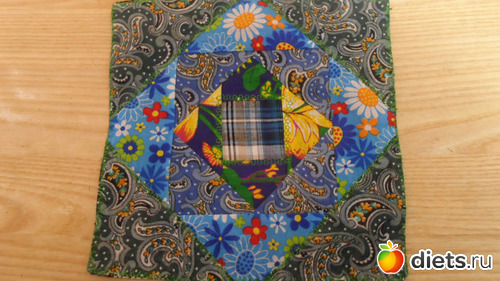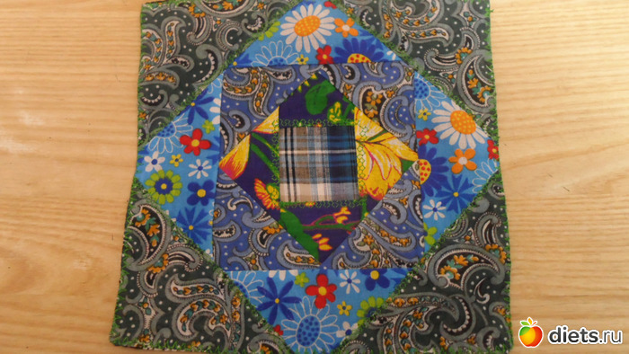 2. Наконец-то решилась сшить пэчворк "Квадрат в квадрате". Раньше шила пэчворк простой: квадратики, полоски. Это пробная салфетка. Ткань использовала ту, что отдали - обрезки со швейной фабрики. Надо бы контрастные цвета, но делала из того что было.