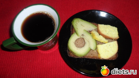 1. Завтрак: кофе, бутерброд с авокадо, копчёным адыгейским сыром с лимонным соком и морской солью.