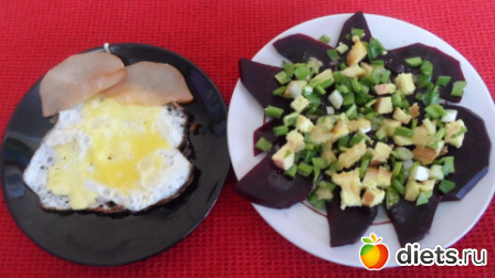 2. Обед: жареное яйцо, куриный балык; карпаччо из свёклы.