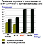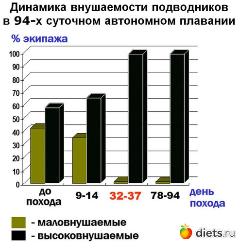 Это значит, что подводники стали очень восприимчивы к влиянию сигналов окружающей среды и внутренней среды организма. Они стали доступны лечебному внушению настолько, что оказалось возможным успешное лечение заболеваний, которые на берегу лечить словом было бы довольно сложно (устранение обострения геморроя, пародонтоза, стойкое обезболивание зубов на весь период похода, устранение гнойничковых высыпаний на коже и др.).