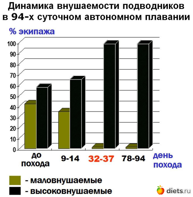 Научные исследования показали, что спустя месяц пребывания в условиях "самоизоляции" с влиянием всех негативных факторов гермообъекта произошло резкое повышение внушаемости подводников, достигавшее 98,6 % экипажа. Это было защитной реакцией психики, своеобразным механизмом психического выживания в агрессивных и возможно опасных для жизни условиях. Ссылка на материалы кандидатской диссертации .