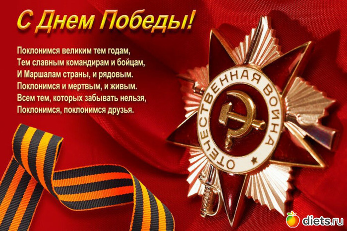 День Победы! Поклонимся великим тем годам, тем славным командирам и бойцам, и маршалам страны, и рядовым, поклонимся и мёртвым, и живым, всем тем, которых забывать нельзя, поклонимся, поклонимся, друзья. Всем миром, всем народом, всей землёй поклонимся за тот великий бой.