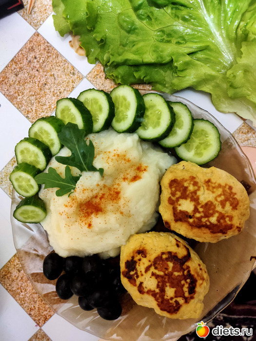 Котлетки из куриной грудки и немного лучка там, ещё мои любимые специи. И это не пюре из картохи, а пюре из цветной капусты. Кстати, очень вкусно!
