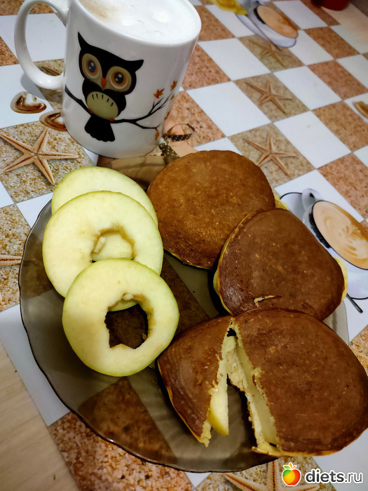Панкейки из протеина, кефира и яиц, в середине яблочко.