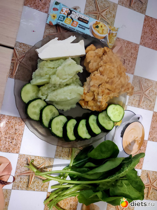 Как раз тот протеиновый батончик в котором всего 99 калорий. Сырок фета, мелко порезанная куриная грудка пожаренная на сковородке с антипригарным покрытием конечно же без масла, та же пюрешка из цветной капусты.