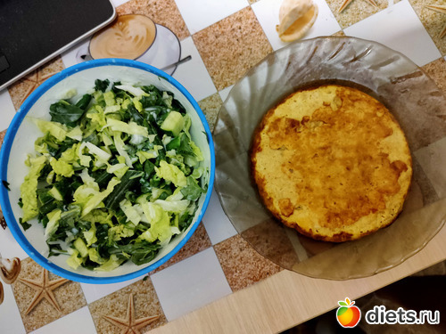 Салатик из зелени (шпинат, руккола, салат), огурца, пекинской капусты и стручковой фасоли, заправленный ложечкой сметаны. Эта жёлтенькая лепёшка: мелко порезанная куриная грудка со специями и яйцом.