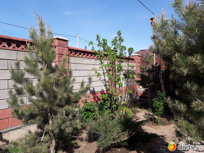 это за домом, прошлогодние ёлочки-сосны растут