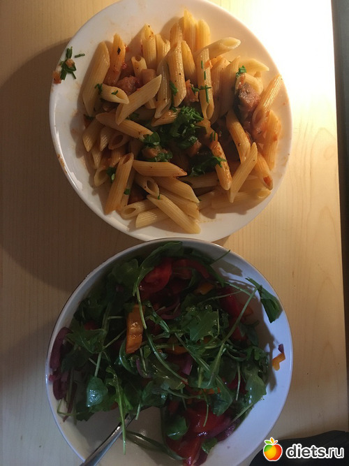 По питанию сегодня было прекрасно, так как я посвятила день творчеству и даже специально вспоминала, что надо покушать. Завтрак как обычнго, на обед была паста с рататуем и салатик. Рататуя вчера наделала много, не такой красивый как в мультфильме "Рататуй" (такой у меня сын только умеет делать), с расчетом на несколько дней.