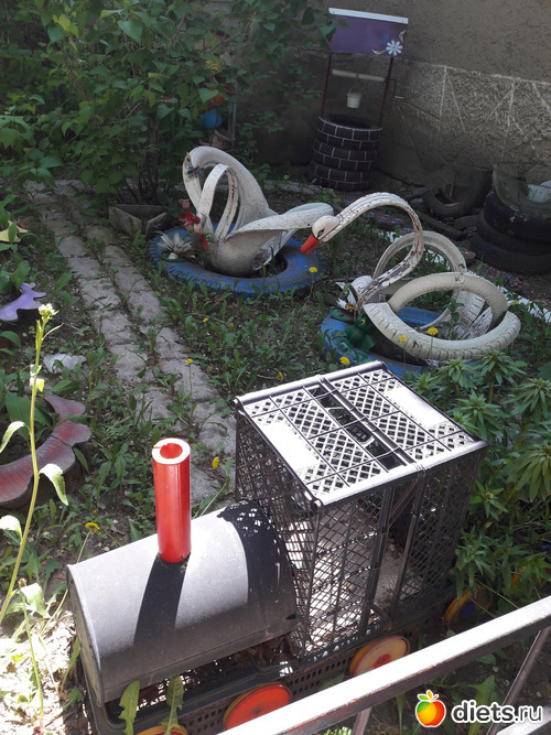в палисаднике ещё грибочки - мухоморы из тазиков, чёт не сфоткала, но там целый полёт мысли и творчества))) всё из подручных материалов-отходов.