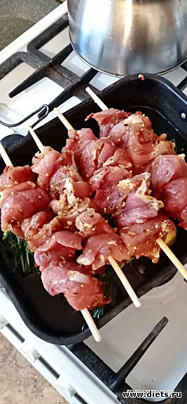 - Маринованное мяско нанизываем на шпажки, по размеру сковороды. Сковорода будет играть роль мангала). Чтобы сок с мяса не горел стелим в сковороду фольгу и наливаем немного воды. Если в сковородку добавить дольку чеснока и веточку розмарина будет вообще - Ставим в разогретую духовку и запекаем до готовности ( минут 25-30, смотрите по своей духовке)