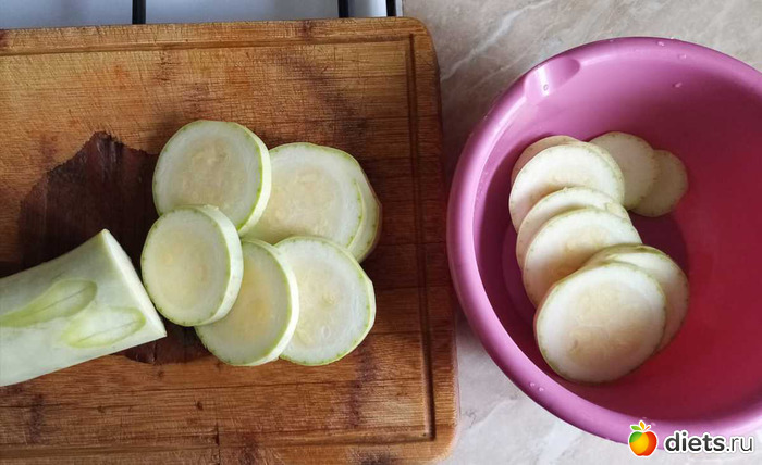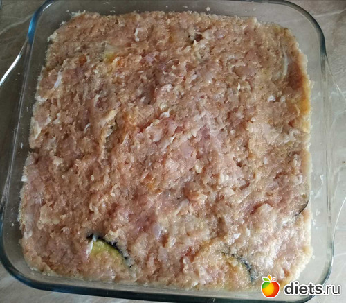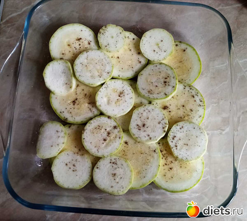 И по-очереди выложила слоями сначала кабачки (посолила, поперчила)