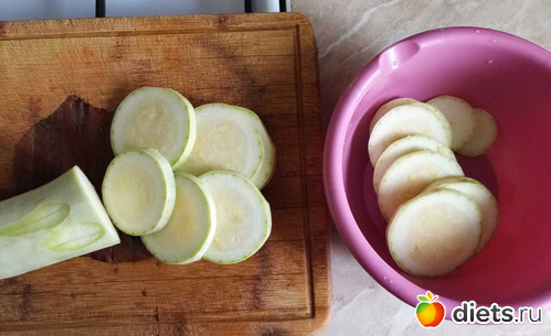 Затем нарезала овощи тонкими кружками 3-4 мм