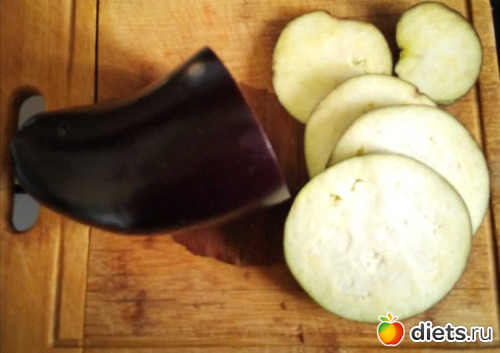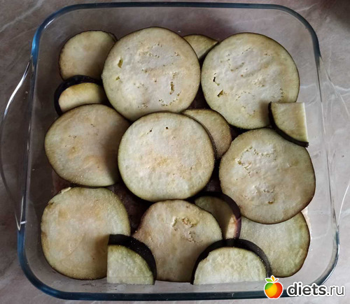 Затем слой баклажан, посолила и натерла сухим чесноком