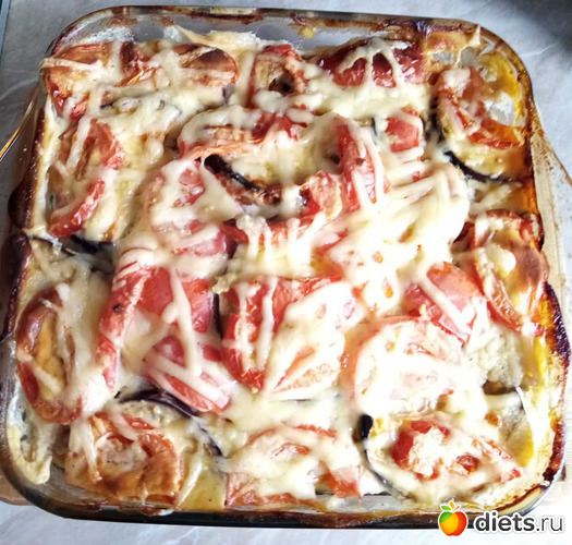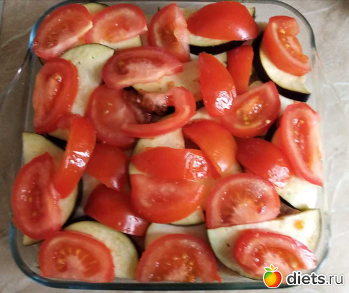 Сверху выложила слоями остатки овощей - кабачки, баклажаны и сверху помидоры