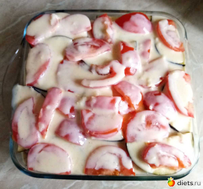Можно также приготовить ее без фарша, а слои овощей залить заливкой или посыпать сыром, смазать сметаной