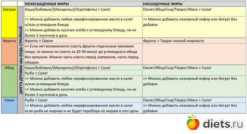 Здесь применяю принцип разделения употребления продуктов с содержанием насыщеных и ненасыщеных жиров.
