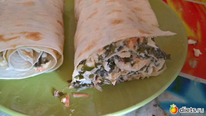 , интересное решение для тех, кто не знает что покушать. Первое что я сделала купила лаваш, собиралась ведь шаурму ваять, но получилось, то что получилось. Итак, блюдо горцев не удалось, зато вышла дальневосточная шаурма Аля Натали. Вспомнила что в холодильнике есть банка морской капусты, немного майонеза, 3 яйца, и половинка чеснока, потерла мацарелу. Яйца сварила, почистила и вилкой помяла туда же добавила нарезаный чесночек, морскую капусту, морковку потертую на мелкой терке и завернула все в лаваш. Это чудо разделила на две части и в обед и в ужин съела. Сытно и вкусно. Еще был кусочек мацарелы с чаем