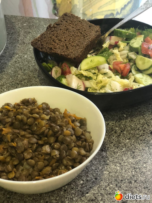 Завтрак: банан+яблоко, обед : чечевица с обжаренным луком с морковкой+овощной салат+кусок черного хлеба, очень сытно, прям до вечера хожу после чечевицы с ощущением, что недавно поела