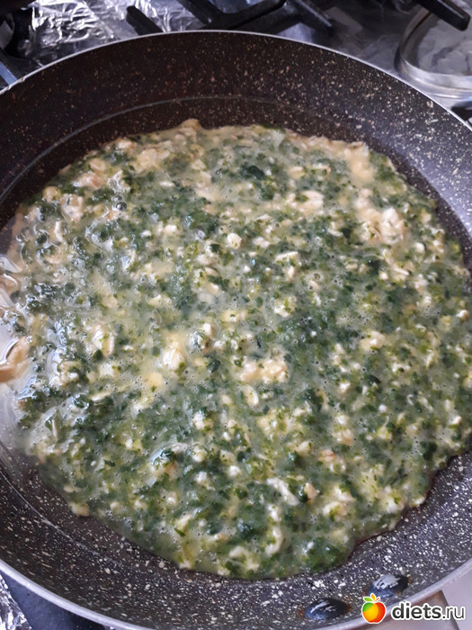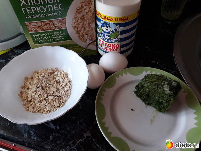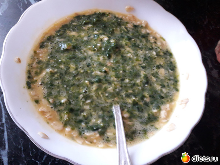 Смешайте геркулес, яйца, шпинат до однородного состояния