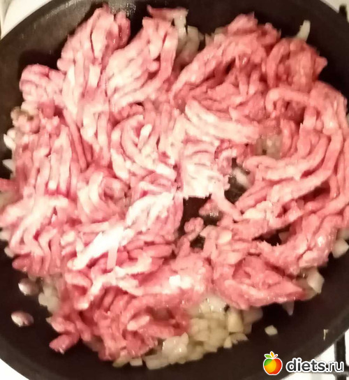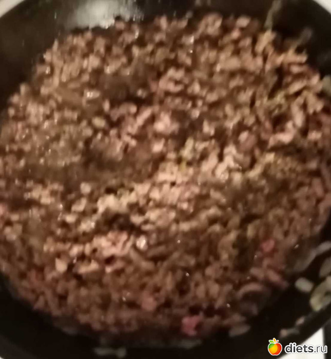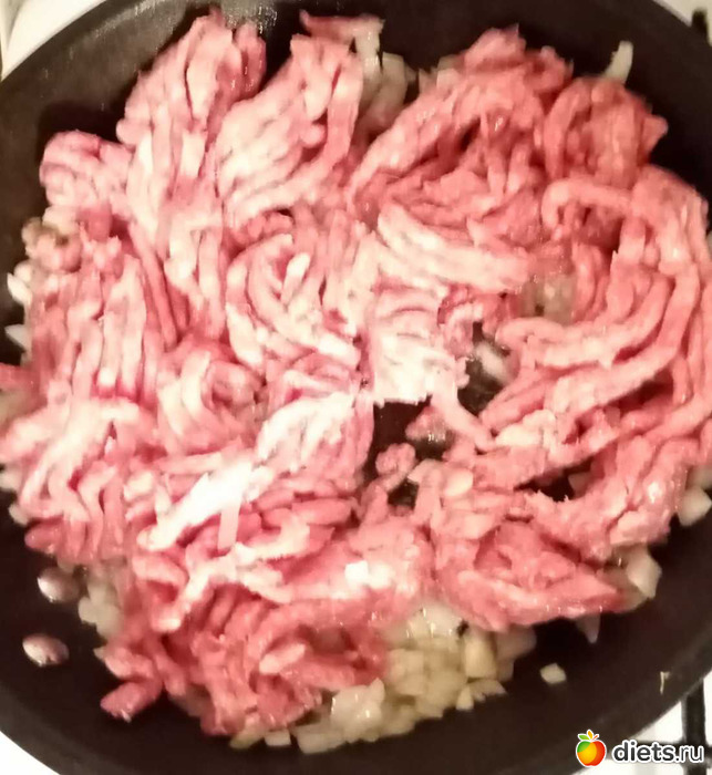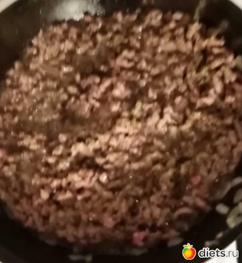 1 слой - фарш обжаренный с измельченным луком, подсоленный по вкусу и специи по вкусу