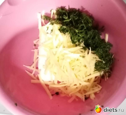 2 слой (из Валечкиной плацинды) творог смешанный с натертым сыром и зеленью