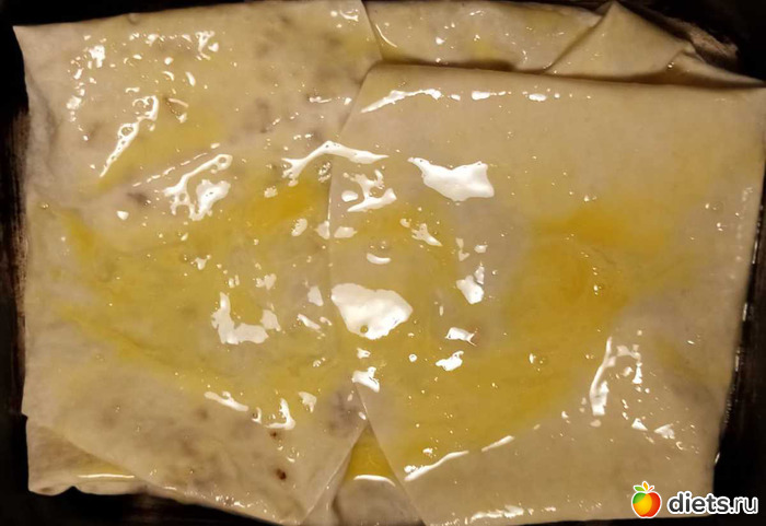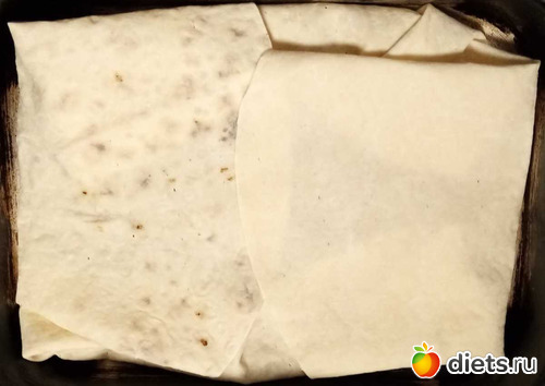Третий слой - также выложила сверху предыдущего лаваш, смазала его яйцом изнутри