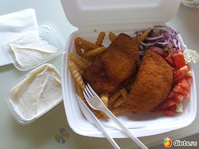 обед на вынос из закусочной, эта порция на двоих нам с дочкой