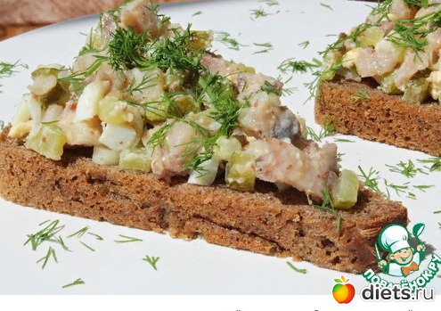 Отличная холодная закуска, которая подается на черном хлебе. Единственный минус - настаивается она в холодильнике сутки, мы столько не выдержали - пробовали через 12 часов - это очень вкусно!