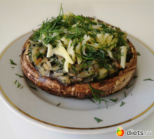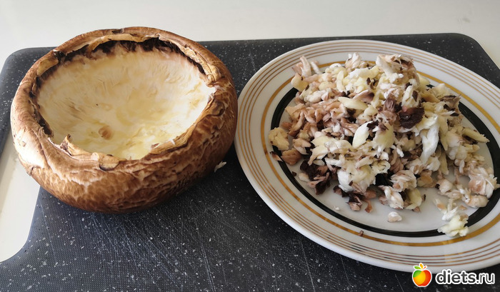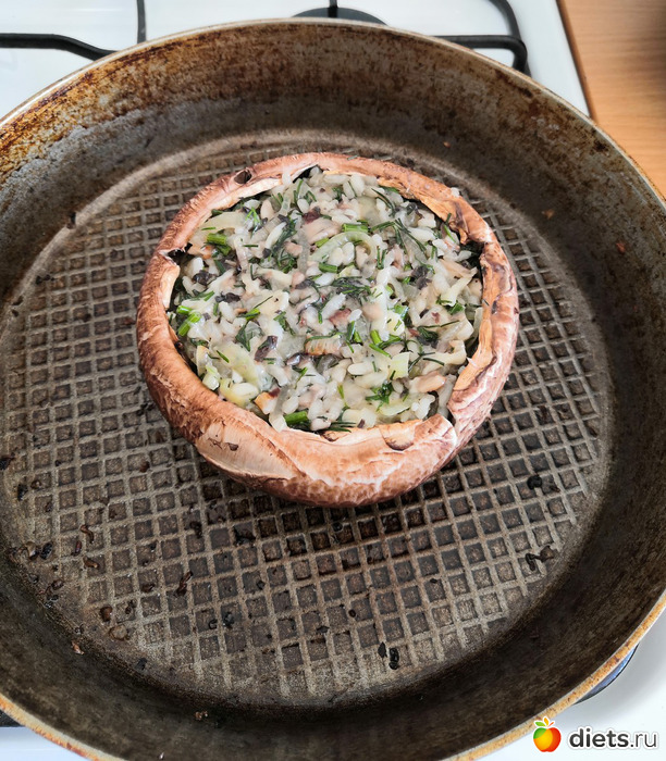 Нафаршировать Портобелло начинкой и отправить в духовку запекаться минут на 15 (температуру не знаю, у меня газовая духовка, газ был выкручен на максимум).