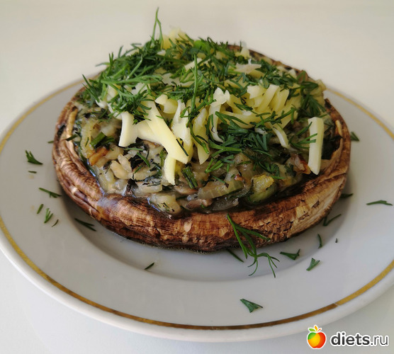 Достать Портобелло из духовки, выложить на тарелку, посыпать тертым сыром и укропом.