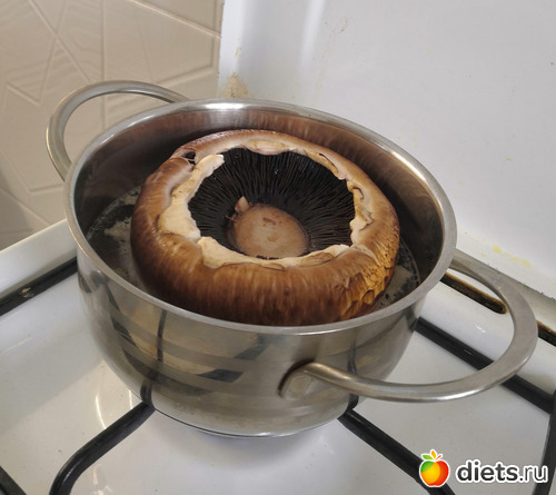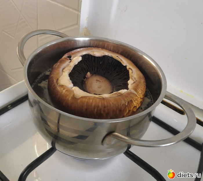 Шампиньон набрал воды (хорошо, у меня это был бульон, поэтому вкус был чуть лучше). Кроме того, вся начинка не влезла, пришлось ее смешать с подушкой из овощей.