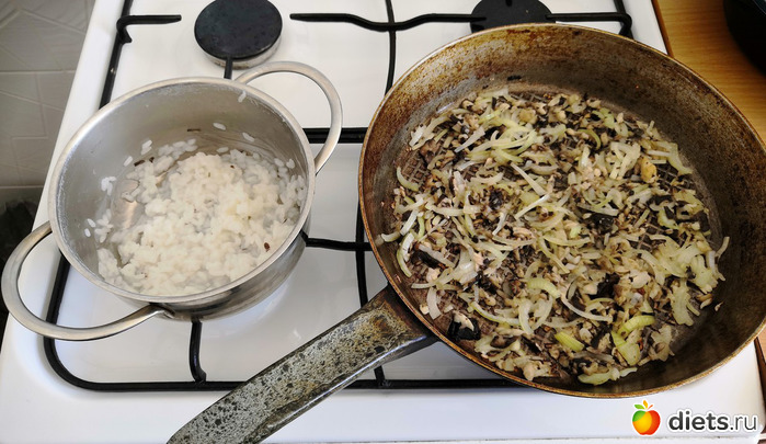 Мякоть гриба и репчатый лук обжарить в минимуме масла. Смешать с рисом.