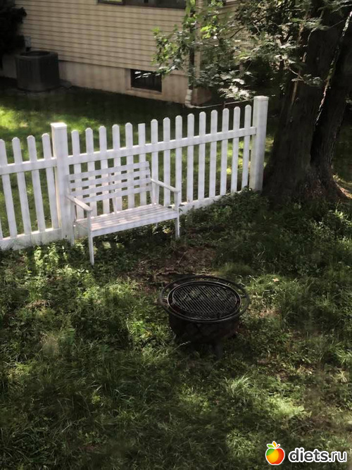 Еще я помыла забор - он белый поэтому вся земля-трава на нем, поставила скамеечку к нему. Получилось симпатично. А сегодня, пока бегала увидела, как кто-то выкинул чашу для костра. Мы ее себе взяли. Она в прекрасном состоянии. И все решетки. Можно мясо жарить даже.