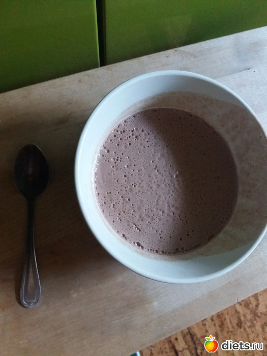 ПП пуддинг (ряженка, банан, какао, желатин, фото ниже), кофе с молоком