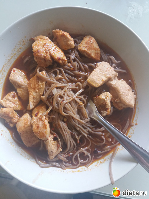 курица карри с макаронами соба (50 г макарон, 200 г курфиле, фото ниже)
