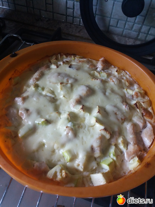 запеканка из курогруди с кабачками (курогрудь, кабачки, яйца, сметана, фото ниже)