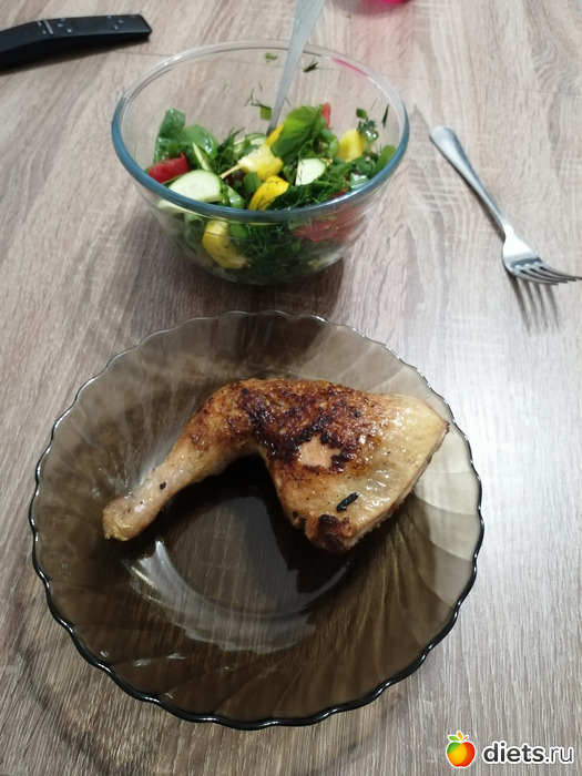 21:00 куриный окорочок, жареный на топлёном масле, овощной салат.